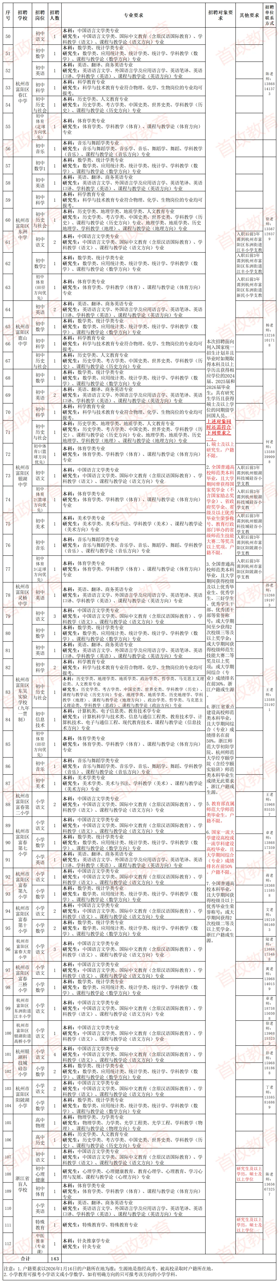 本次招聘教师143名,其中普高18名,职高10名,初中80名,小学27名,浙江省盲人学校8名,具体岗位及相关要求见《杭州市富阳区面向2026年优秀应届毕业生招聘中小学教师岗位计划表》(以下简称《岗位计划表》)附件1。