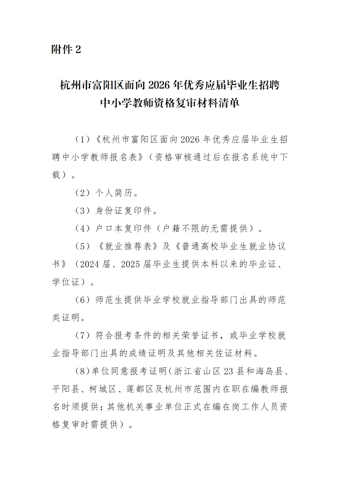 8.现役军人、富阳区在编在岗事业编制教师不得报考,在普通高校脱产就读的非2026届应届毕业研究生不能以原取得的本科学历、学位证书报考。
