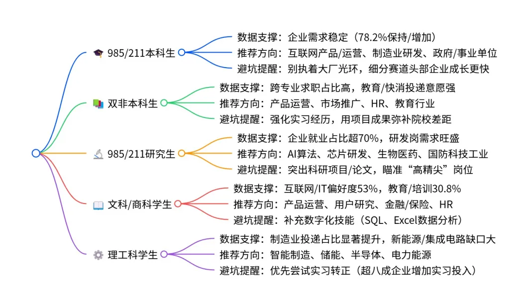 - 坑3:害怕“跨专业”—— 45%的学生跨专业求职,产品运营、市场推广、HR等岗位尤其欢迎文科/商科跨界,核心是用技能弥补专业差距;