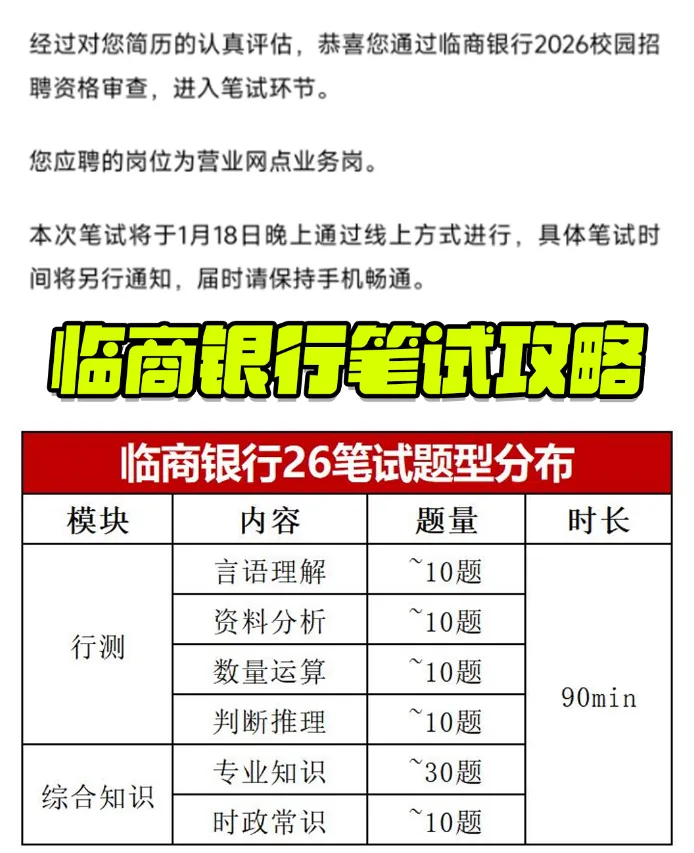 临商银行 2026 年校园招聘笔试将于 1 月 18 日晚以线上形式进行,总时长 90 分钟,整体呈现 “行测打底、专业为重、兼顾时政” 的命题特点,对考生的综合能力与金融素养均有考察。