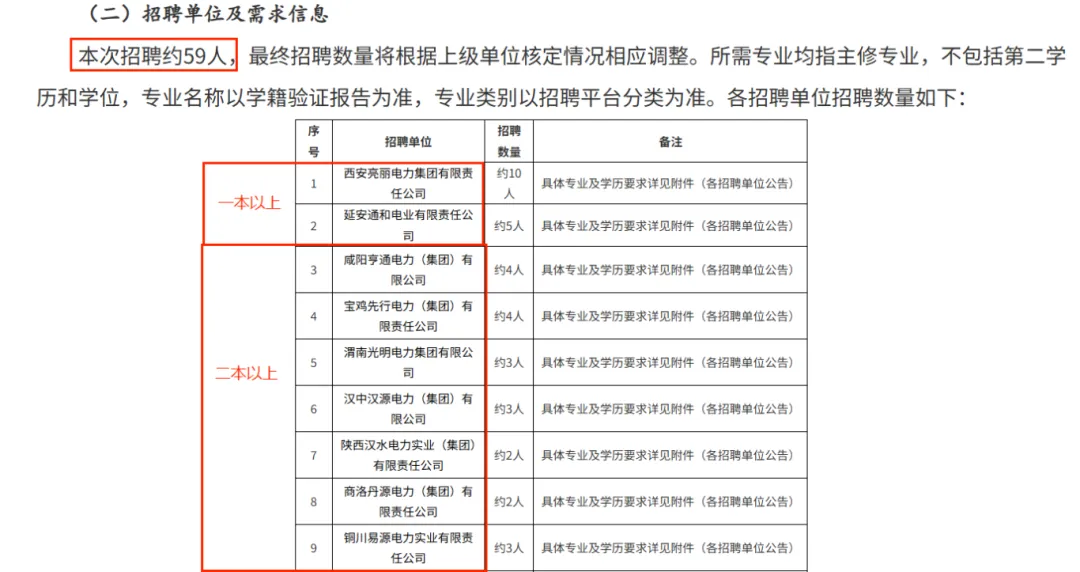 身份:国网陕西省电力公司 全省统招 定位:补充基层岗位,主招电工专业, 非电专业仅限(财会、管理、机械等) 岗位方向:市/县局 技术岗、营销岗、客服岗 招聘人数和条件:全省仅59人,西安、咸阳要一本以上应届毕业生 。其他地区二本以上,部分单位要研究生