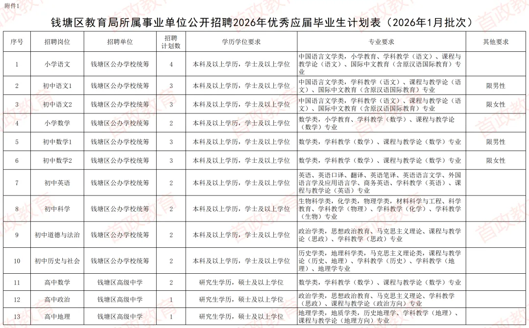 杭州市钱塘区教育局所属事业单位公开招聘2026年优秀应届毕业生公告(2026年1月批次)