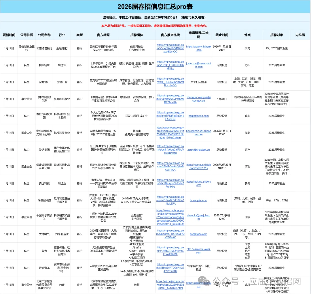 此表格包含了当前的秋招+秋招补录+2026春招信息包括国央企、事业单位、私企、外企、合资企业,全行业类型!涵盖互联网/金融/科技/制造业/咨询/快消/医药/地产/教育/文娱等行业订阅费用:39元