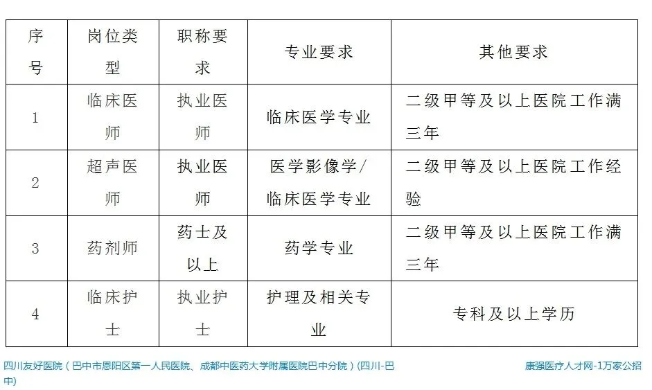 四川友好医院作为一家集医疗、教学、科研、预防、保健于一体的国家三级乙等综合医院,现因业务发展、学科建设与人才梯队培养需要,面向社会诚聘各类专业人才。