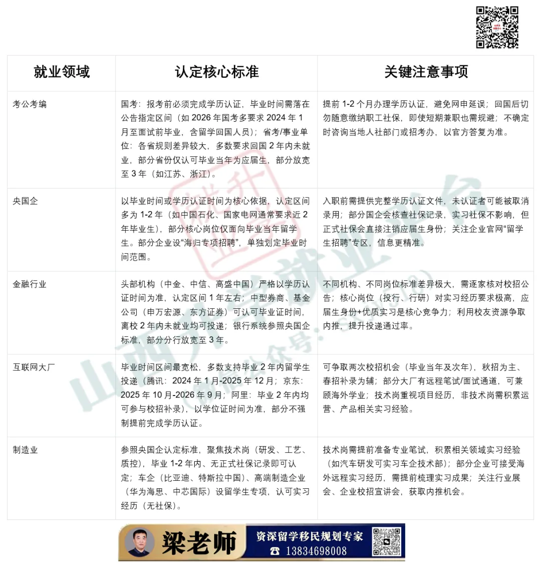学历认证时间」「社保缴纳情况」「就业状态」综合判定。因中外学制差异,留学生常面临求职节奏与国内校招错位问题,不同行业认定规则、各学制求职规划差异显著,具体说明如下: