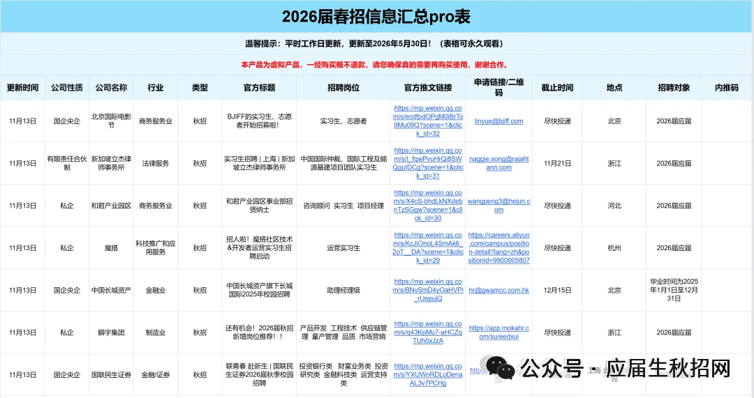 1:我们对接了大量的企业HR/高管/项目负责人/项目组成员/继任招募者,委托我们发布的实习/全职招聘信息都具有非常强的时效性!每日精选10条以上当日实习信息,会员专属!2:我们会定期整理汇总表,分时间:春招/秋招网申汇总表、寒暑假实习信息汇总表、远程实习信息汇总表等...分行业:国企央企汇总表/金融/咨询/互联网/事务所/快消岗位汇总表/国家部委招聘信息等等,每周第一时间分享到VIP会员群!部分展示示如下👇2025-2026年度会员将获得25个+招聘汇总表权益,每个表格将持续更新到周期结束覆盖行业全面:银行/证券/基金/保险/期货/互联网/电子商务/计算机软件/通信/国家机关/高校/研究所/事业单位 /教育/会计师事务所/咨询公司/法律/消费品/零售/服装/家具/贸易/制造业/汽车/电子/电器/机械/石油/钢铁/电力/能源/煤矿/化工/生物/制药/医疗/农林/畜牧/媒体/广告/旅游/公关/文化/影视/酒店.........个性化筛选:所有信息均支持自主筛选,行业-企业-截止时间-投递链接-工作地点…,分门别类,一目了然,既能海投,又能精准投递。每周校招截止提醒⏰:每周截止校招专属提醒,不错过任何一个机会!包括国央企、事业单位、民企、外企、合资企业......。