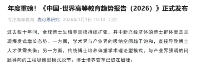 麦可思研究院《中国-世界高等教育趋势报告(2026)》指出,博士教育正面临全球性的结构性挑战。