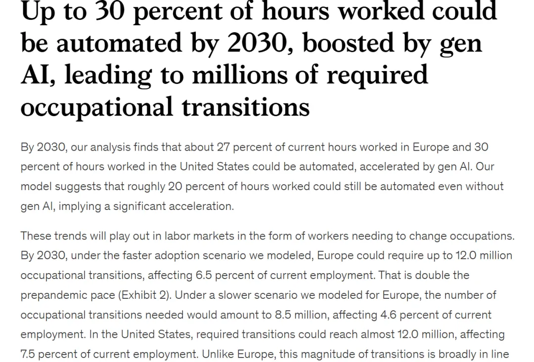 需要专业知识、管理、人际互动、不可预测体力劳动的任务: 自动化潜力显著更低,普遍低于30%(如战略决策、复杂客户沟通、医疗诊断、创造性设计、高级研发)
