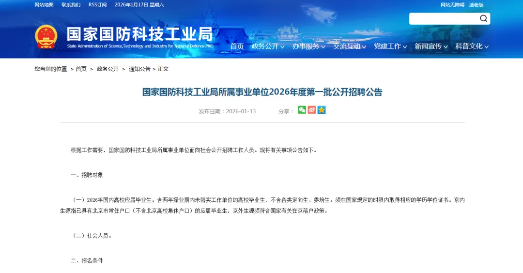 工学类专业可报,应届生和社会生均可.需要研究生学历.国家国防科技工业局所属事业单位2026年度第一批公开公告