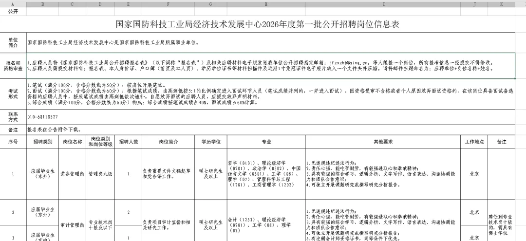 >工学类专业可报,应届生和社会生均可.需要研究生学历.国家国防科技工业局所属事业单位2026年度第一批公开公告
