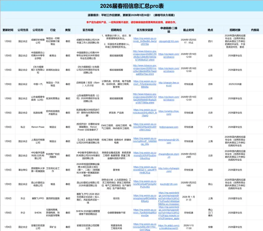免费领取26年春招网申汇总表