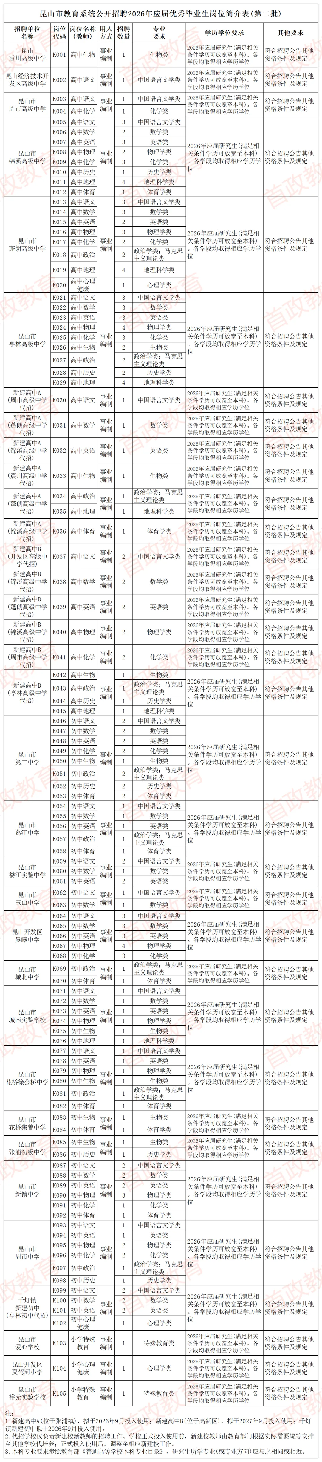 详见附件《昆山市教育系统公开招聘2026年应届优秀毕业生岗位简介表(第二批)》。