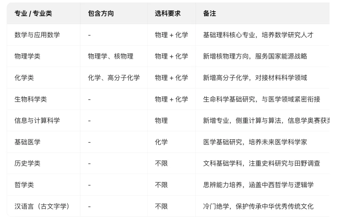 培养模式:本硕博贯通培养,设立相辉学堂,小班化教学(20-30 人 / 班),一对一顶尖导师制,首届强基毕业生转段申请通过率达 100%复旦大学选拔机制:分为A 类考生(高考成绩优异)和B 类考生(五大学科奥赛全国金银牌得主),A 类需参加初试笔试 + 复试,B 类可免初试直接入围复试动态考核:建立阶段性考核与动态进出机制,学业优秀者在公派留学、奖学金等方面予以优先安排复旦大学学科覆盖:文理医全面布局,涵盖数学、物理、化学、生物、医学、文史哲等基础学科,新增核物理、高分子化学、信息与计算科学等战略专业二、招生专业与选科要求
