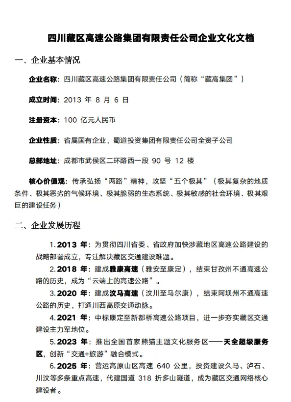 企业文化与国企常识(5-10 题):藏高集团发展历程、核心业务(高速公路投资、建设、运营)、企业使命与价值观;国企相关法律法规(如《公司法》《安全生产法》)。