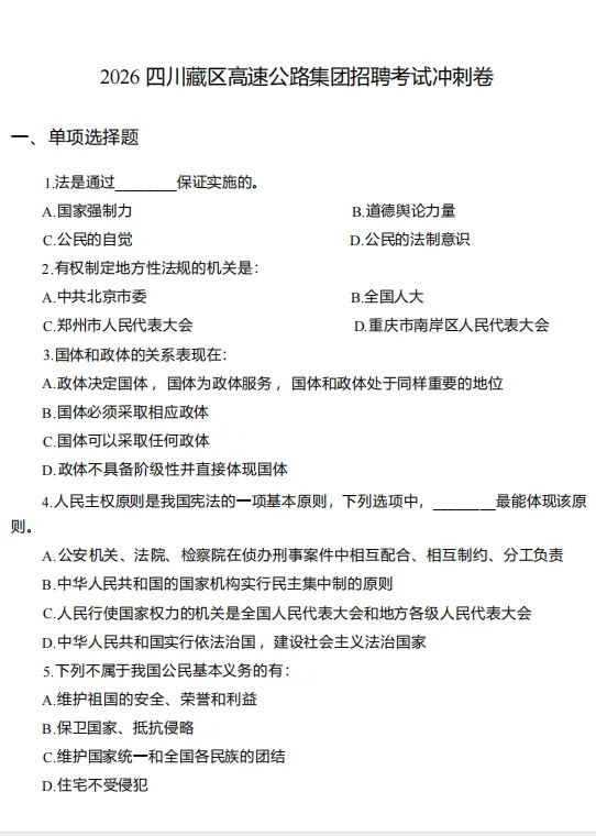 交通行业常识(10-15 题):高速公路建设与养护知识、交通工程安全规范、路桥工程基础概念、四川省交通发展规划(重点关注藏区交通建设相关内容)。
