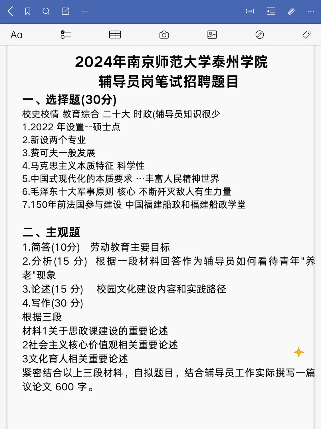 【真题分享】2024年南京师范大学泰州学院辅导员岗笔试招聘题目