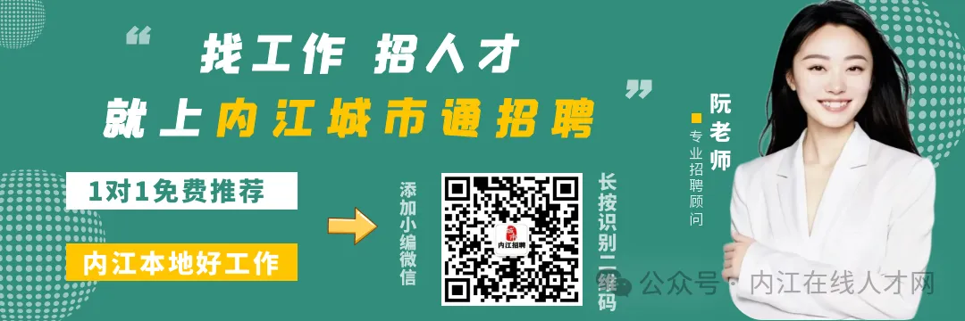 最近有想找工作的吗?内江招聘频道又为大家更新了一批新的招聘职位,想找工作的都可以进来看看,说不定有你合适的工作!有亲朋好友想找工作也可以帮我们转发推荐,找工作找人才就上内江!我们专注内江本地招聘,致力于为您提供优质招聘求职服务!