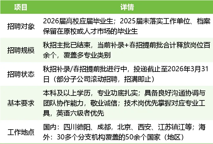 薪资待遇:硕士年薪10-16万,优秀者或效益好的子公司可达18万+;本科年薪8-12万;年终奖1-3个月工资,按公司效益与个人考核发放,重点项目享额外奖励;工龄、职称、证书等专项津贴随资质提升递增。保障福利:六险二金(养老保险、医疗保险、失业、工伤、生育、补充医疗+住房公积金、企业年金),部分子公司加投商业意外险升级为七险二金,公积金按12%比例缴纳;年度体检,补充医疗覆盖部分自费项目。补贴与配套:住房补贴1-2万/年,部分子公司提供员工宿舍或公寓;交通/通讯补贴每月300-800元;带薪年假、法定节假日、产假、陪产假等足额享受。发展支持:完善培训体系(新员工培训、技能提升、职称培训、在职学历教育等),鼓励攻读硕博学位并给予激励;“青蓝计划”管培生培养后可竞聘二级企业部门助理级干部,技术与管理双通道晋升。五、投递方式与招聘流程