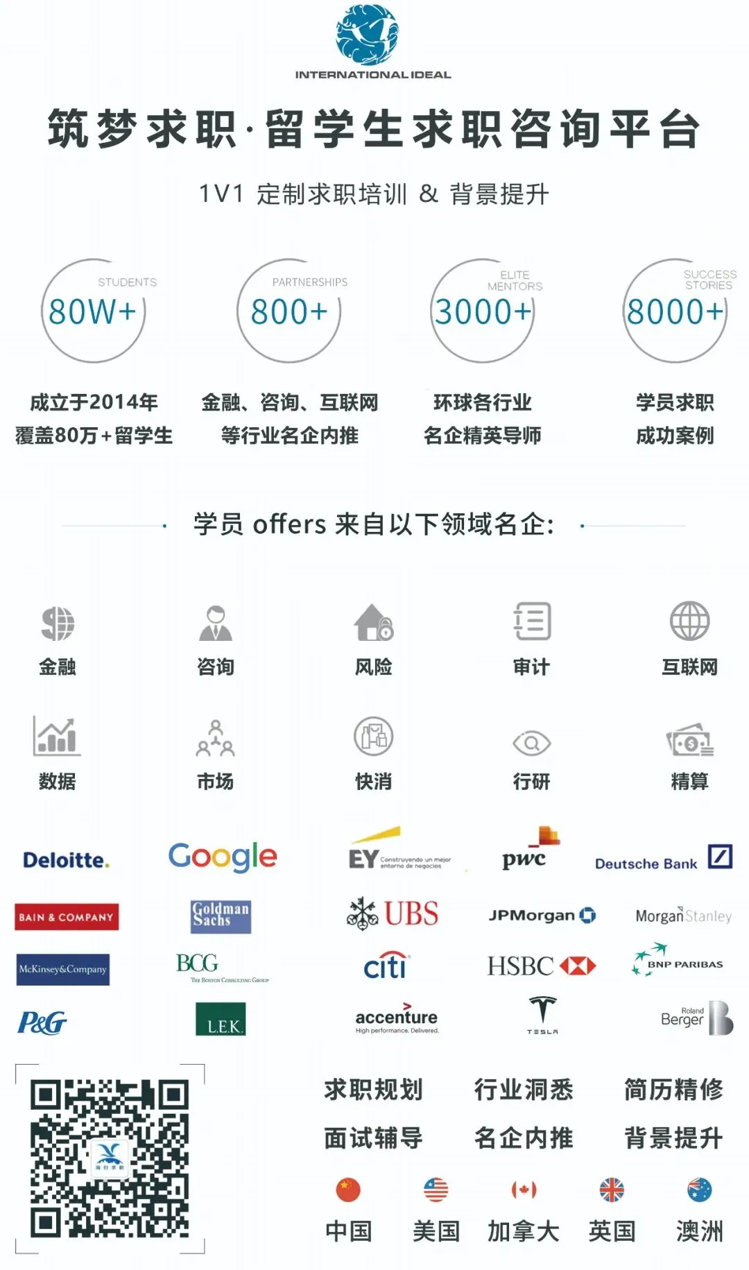 筑梦 INTERNATIONAL IDEAL(2014年成立并注册于美国),是北美最早成立的留学生求职咨询平台之一,目前覆盖全球留学生超过80万人。我们荣登“福布斯华人精英TOP100”以及“胡润百富创业领袖”榜单,至今已帮助 8000+ 学员获得来自Goldman Sachs、McKinsey、Deloitte、P&G、Google、Meta等名企的Offers。我们的服务包括:求职辅导、背景提升、名企内推、海外游学等;商务合作请联系:Coop@internationalideal.com