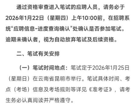 从考试安排来看,本次笔试呈现出流程严谨、时间紧凑的特点。考生需在 1 月 22 日 10:00 前完成笔试确认,逾期未确认将被视为自动放弃;