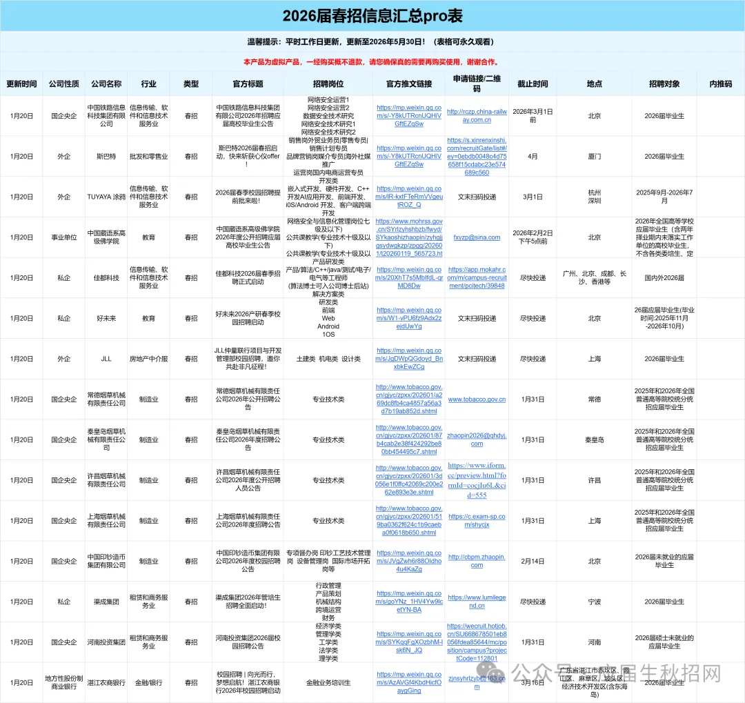 1:我们对接了大量的企业HR/高管/项目负责人/项目组成员/继任招募者,委托我们发布的实习/全职招聘信息都具有非常强的时效性!每日精选10条以上当日实习信息,会员专属!2:我们会定期整理汇总表,分时间:春招/秋招网申汇总表、寒暑假实习信息汇总表、远程实习信息汇总表等...分行业:国企央企汇总表/金融/咨询/互联网/事务所/快消岗位汇总表/国家部委招聘信息等等,每周第一时间分享到VIP会员群!部分展示示如下👇2025-2026年度会员将获得25个+招聘汇总表权益,每个表格将持续更新到周期结束覆盖行业全面:银行/证券/基金/保险/期货/互联网/电子商务/计算机软件/通信/国家机关/高校/研究所/事业单位 /教育/会计师事务所/咨询公司/法律/消费品/零售/服装/家具/贸易/制造业/汽车/电子/电器/机械/石油/钢铁/电力/能源/煤矿/化工/生物/制药/医疗/农林/畜牧/媒体/广告/旅游/公关/文化/影视/酒店.........个性化筛选:所有信息均支持自主筛选,行业-企业-截止时间-投递链接-工作地点…,分门别类,一目了然,既能海投,又能精准投递。每周校招截止提醒⏰:每周截止校招专属提醒,不错过任何一个机会!包括国央企、事业单位、民企、外企、合资企业......。