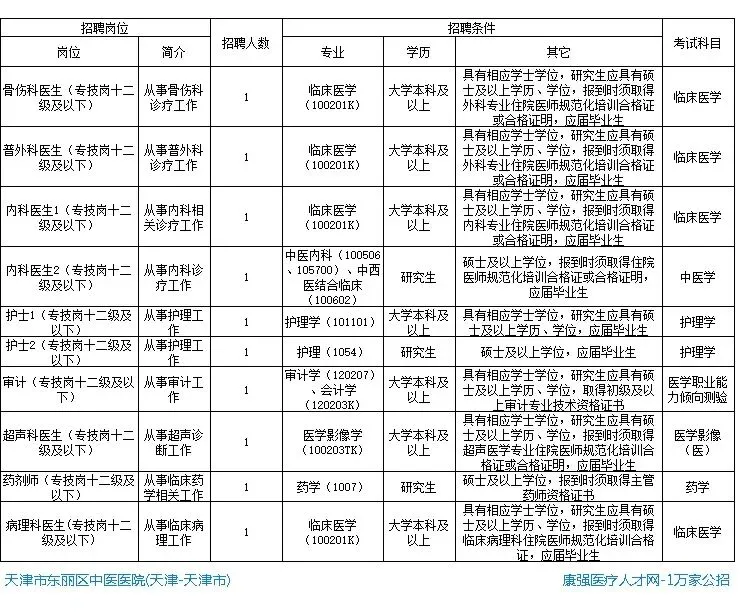 天津市东丽区卫生健康委员会2026年公开招聘专业技术人员计划表