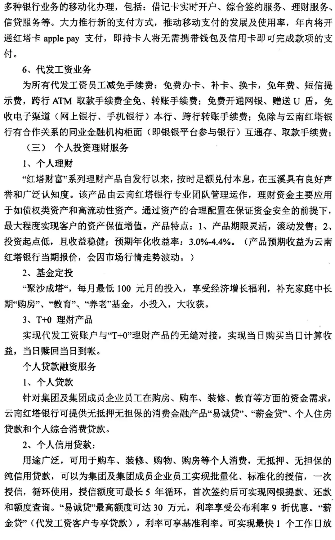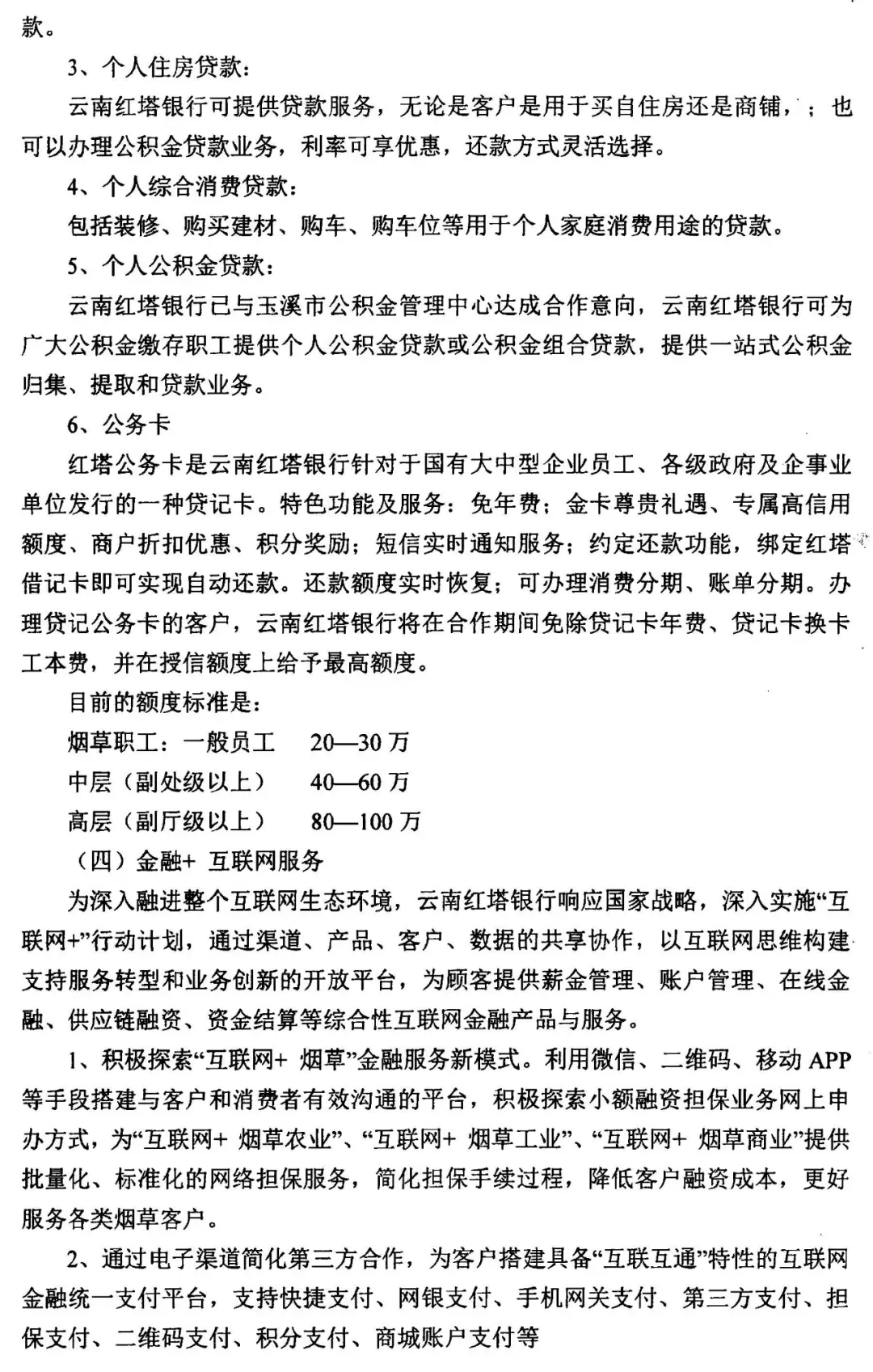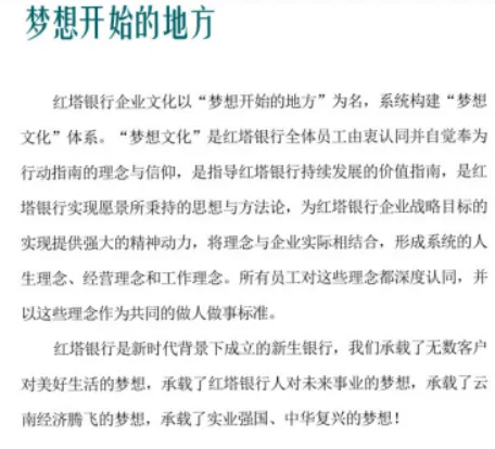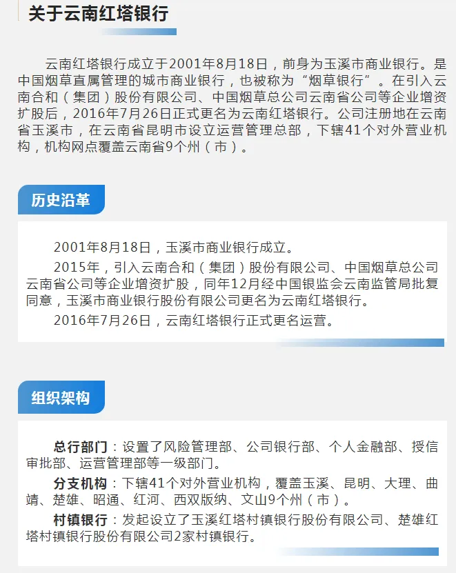 云南红塔银行前身为2006年5月26日开业的玉溪市商业银行。2015年,在引入云南合和(集团)股份有限公司、中国烟草总公司云南省公司等有实力的企业法人投资入股,并向在册股东定向增发股份后,2015年12月21日,中国银保监会云南监管局批复同意玉溪市商业银行股份有限公司更名为云南红塔银行股份有限公司,简称“云南红塔银行”。云南红塔银行股份有限公司是中国烟草直属管理的一家城市商业银行,于2016年7月26日正式更名运营。本行坚持“扎根行业、服务云南、走向全国、辐射南亚及东南亚”的发展定位,聚焦建设“一流产业银行、特色首选银行、优势数字银行、梦想文化银行”四大目标,探索“产融结合”新模式、新路径,形成具有自身特色的金融服务体系,不断开创跨越式高质量发展新局面。
