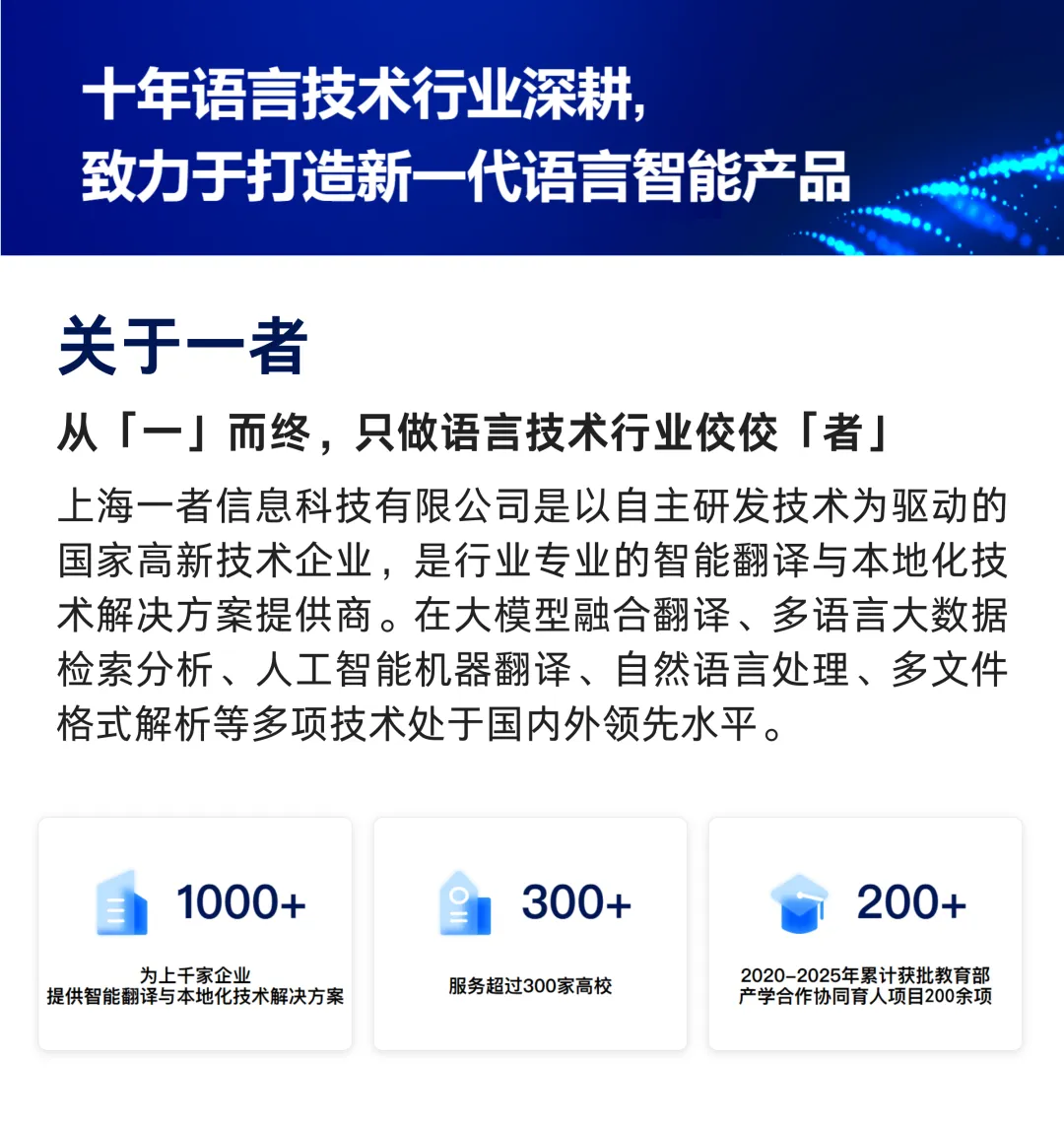 一者科技是以自主研发技术为驱动的国家高新技术企业,2025年获评上海市“专精特新”中小企业,在大模型融合翻译、多语言大数据检索分析、人工智能机器翻译、自然语言处理、多文件格式解析等多项技术处于国内外领先水平,产品主要包括YiCAT翻译管理平台、YiLOC本地化管理平台、YiCorpus多功能语料库检索平台、YiSight区域国别研究平台、Tmxmall在线对齐等。