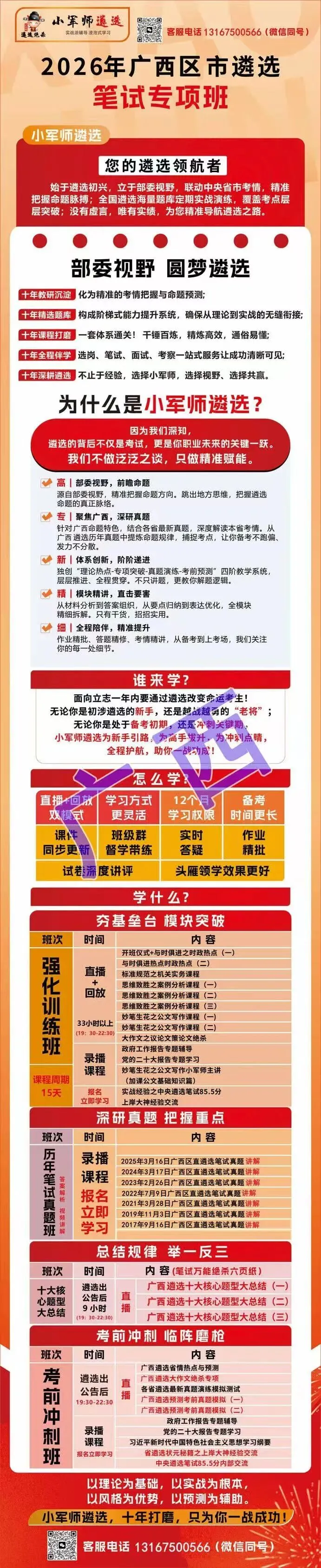 为助力2026年广西遴选笔试备考,小军师遴选开设了2026年度广西遴选专项班,火爆报名中!十大核心题型大总结班、历年真题讲解班、考前冲刺班同步开课!从发布公告到参加笔试,备考时间不足两个月,大家报上名就要心无旁骛开始全身心的备考和学习了,现在入班还来得及,领取课程优惠可以私聊下方客服老师哦!关山难越,步步为营终可越;长路虽漫,曙光在前亦璀璨。你今日的笃行,必将照亮明日的征程。小军师遴选,全程为你助力。2025中央及省市遴选交流QQ群:275699416腾讯课堂定期组织公开课,战派大神一对一点评+讲解!更多免费学习最新笔试、面试课程,点击“阅读原文”即可获取!