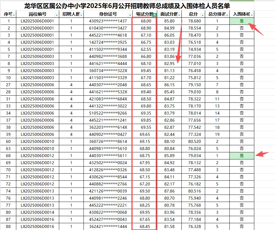 4️⃣ 龙岗区:最低进面分60.2分!低于61分的有5人,其中笔试分60.25的考生竟然成功面试逆袭上岸了!