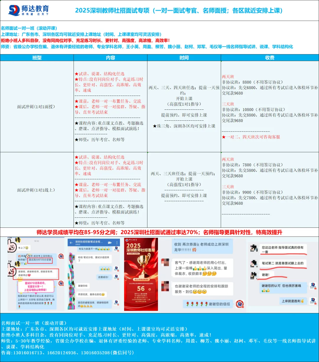 深圳教师面试冲刺,1对1考官、名师指导;出成绩后即可安排