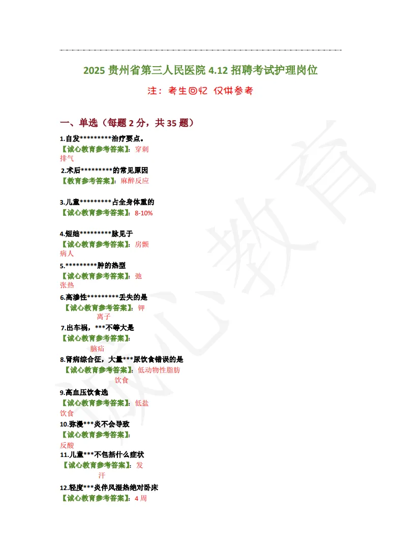 >贵州省第三人民医院往年笔试真题免费领取!!!!