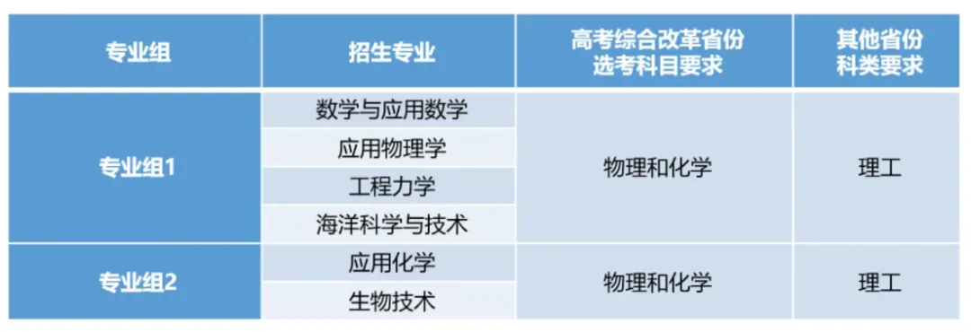 专业组1笔试科目为数理综合,专业组2笔试科目为化学。