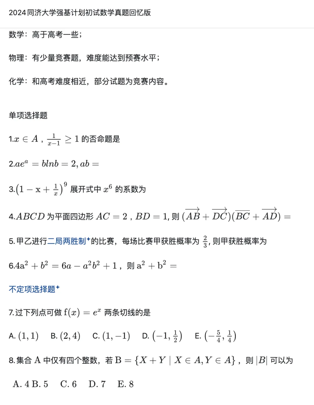 1:同济大学强基计划数学+物理2023-2025年强基计划笔试题及解析
