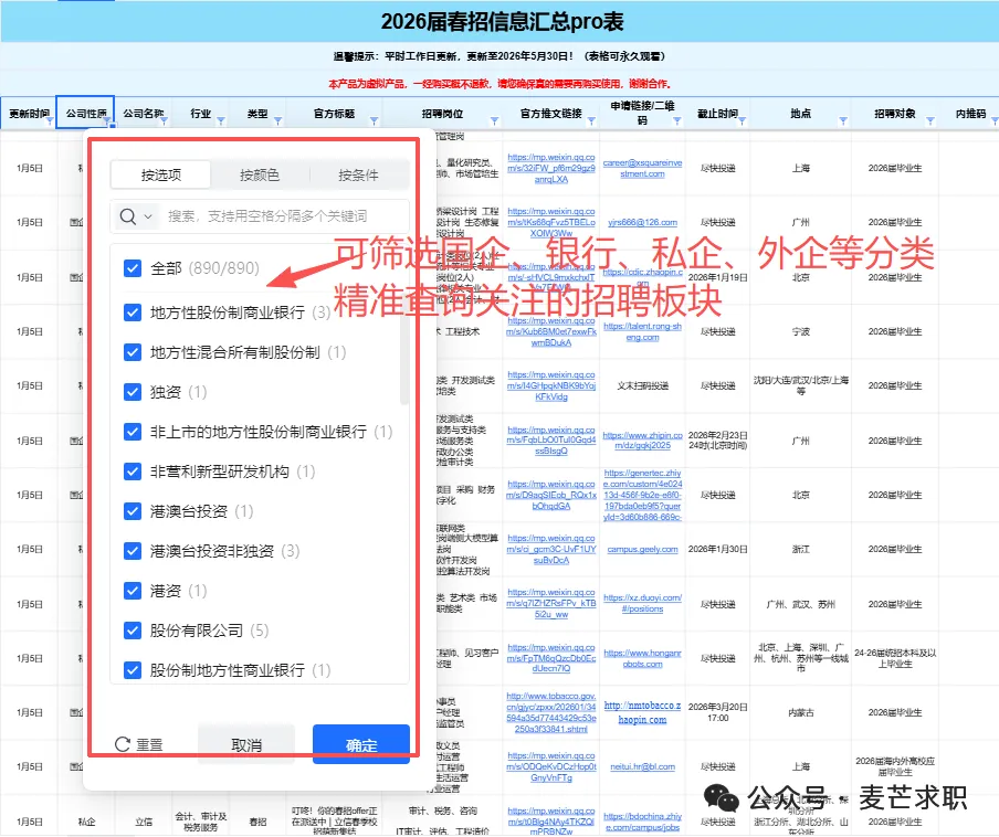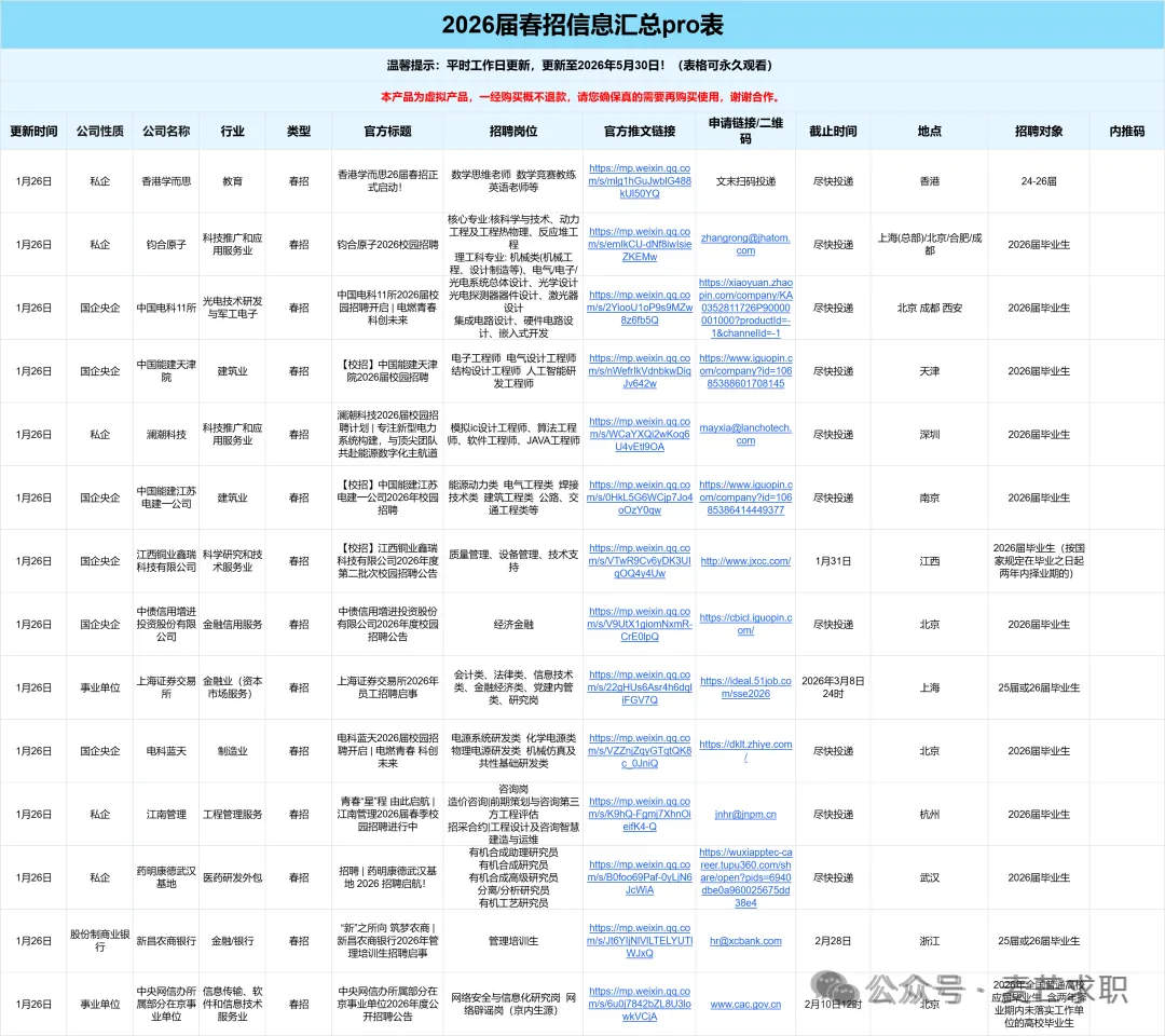 1:我们对接了大量的企业HR/高管/项目负责人/项目组成员/继任招募者,委托我们发布的实习/全职招聘信息都具有非常强的时效性!每日精选10条以上当日实习信息,会员专属!2:我们会定期整理汇总表,分时间:春招/秋招网申汇总表、寒暑假实习信息汇总表、远程实习信息汇总表等...分行业:国企央企汇总表/金融/咨询/互联网/事务所/快消岗位汇总表/国家部委招聘信息等等,每周第一时间分享到VIP会员群!部分展示示如下👇2025-2026年度会员将获得25个+招聘汇总表权益,每个表格将持续更新到周期结束覆盖行业全面:银行/证券/基金/保险/期货/互联网/电子商务/计算机软件/通信/国家机关/高校/研究所/事业单位 /教育/会计师事务所/咨询公司/法律/消费品/零售/服装/家具/贸易/制造业/汽车/电子/电器/机械/石油/钢铁/电力/能源/煤矿/化工/生物/制药/医疗/农林/畜牧/媒体/广告/旅游/公关/文化/影视/酒店.........个性化筛选:所有信息均支持自主筛选,行业-企业-截止时间-投递链接-工作地点…,分门别类,一目了然,既能海投,又能精准投递。每周校招截止提醒⏰:每周截止校招专属提醒,不错过任何一个机会!包括国央企、事业单位、民企、外企、合资企业......。