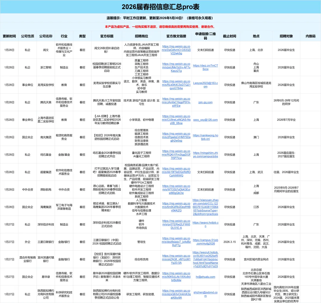 格力电器、中国汽研、中天科技集团、人民网、中央广播电视总台、中国人民银行印钞公司、人民邮电出版社、中国烟草、百度MTS管培生、中国印钞造币集团、白象食品、佳都科技、涂鸦智能、中船智海创新研究院等央国企、事业单位、民企、外企2026届春季校园招聘已经开启!