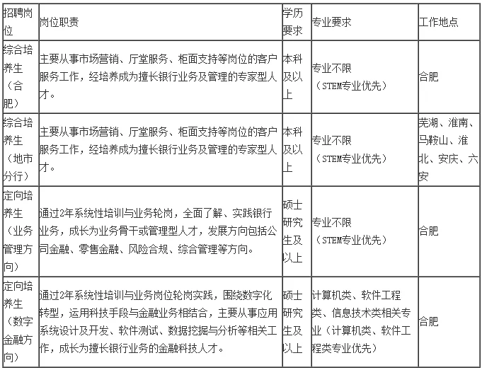 招商银行由招商局于1987年在深圳蛇口创建,是中国境内第一家完全由企业法人持股的股份制商业银行。成立38年来,招商银行已成为沪港两地上市,拥有商业银行、金融租赁、基金管理、人寿保险、境外投行、消费金融、理财子公司等金融牌照的银行集团。2025年,招商银行在《财富》世界500强中位列第193位,在英国《银行家》杂志全球银行1000强排名中位列第8位。 招商银行合肥分行于2001年正式成立,是招商银行的一级分行。入皖24年来,合肥分行深耕江淮大地,辖属机构已覆盖安徽省内合肥、芜湖、淮南、马鞍山、淮北、安庆、六安等7个地级市,营业网点总数43家,正式员工人数1600余人,连续多年获得招商银行“优秀分行”称号。 1.境内院校2026年应届毕业生,要求2026年1月1日至2026年7月31日(含)期间毕业,并获得国家认可的毕业证和学位证; 2.境外院校2025年1月1日至2026年7月31日(含)毕业的应届毕业生,要求在2026年7月31日前取得教育部学历学位认证,未与其他企业建立劳动合同关系; 3.本科需要通过英语四级(425分(含)以上)或同等英语水平(例如雅思5.5分(含)以上,托福70分(含)以上),硕士需要通过英语六级(425分(含)以上)或同等英语水平(例如雅思6分(含)以上,托福80分(含)以上),其他外语若具备同等水平也可视为合格; 5.具有较强的责任心、学习能力和良好的团队协作精神,能承受较大的工作压力,具有良好的书面及口头表达能力。 简历投递→简历筛选→统一笔试→多轮面试→体检→录用。 春招线上简历投递截止时间:2026年4月30日23:59。下载招商银行手机银行APP,登录后前往“招商银行招聘”功能模块,申请感兴趣的职位,在线投递简历!登录“招商银行招聘”官方网站career.cmbchina.com,点击“校园招聘”,申请感兴趣的职位,在线投递简历!关注“招商银行招聘”微信公众号平台,获取最新的校园招聘信息,点击“招了-校园招聘”,搜索“合肥分行”,申请感兴趣的职位,在线投递简历! 1.个人应聘信息须真实、准确和详尽,在线提交简历请认真详细完整填写各项信息,教育经历请从高中填起。准确填写各项信息将是您应聘成功的基础。 2.当您的手机号码变更时,请及时更新注册信息,这是我们跟您联系的重要渠道。 3.如有疑问,欢迎邮件咨询,联系邮箱:hfhrzppz@cmbchina.com。点击关注公众号