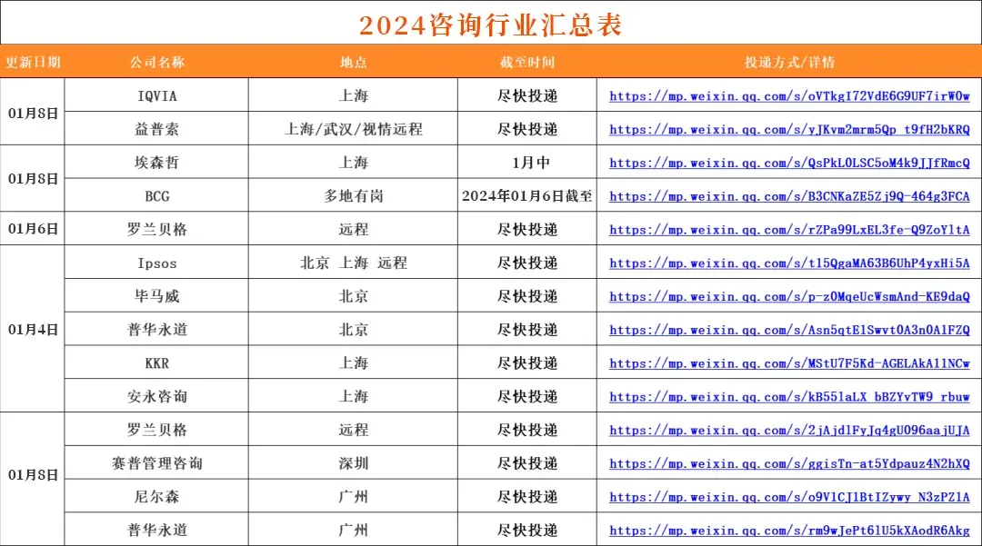 1:我们对接了大量的企业HR/高管/项目负责人/项目组成员/继任招募者,委托我们发布的实习/全职招聘信息都具有非常强的时效性!每日精选10条以上当日实习信息,会员专属!2:我们会定期整理汇总表,分时间:春招/秋招网申汇总表、寒暑假实习信息汇总表、远程实习信息汇总表等...分行业:国企央企汇总表/金融/咨询/互联网/事务所/快消岗位汇总表/国家部委招聘信息等等,每周第一时间分享到VIP会员群!部分展示如下👇3:整理求职资料,包括简历模板,行业知识、笔试真题、模拟题、面试资料、求职指南、技能自学攻略等等,都会第一时间分享给VIP会员。部分展示如下👇