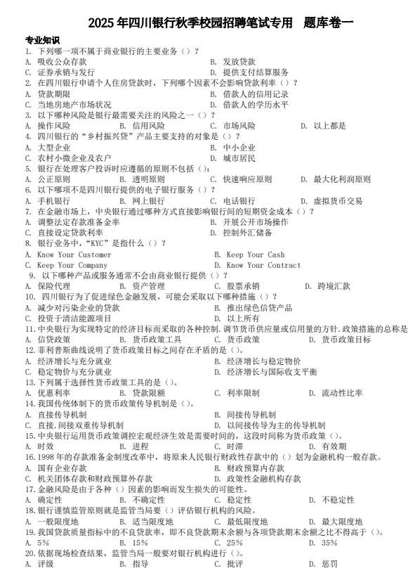 基础为主,贴合商业银行实务 + 四川本土金融,分通用综合知识,无岗位专项考题,零基础也能快速备考