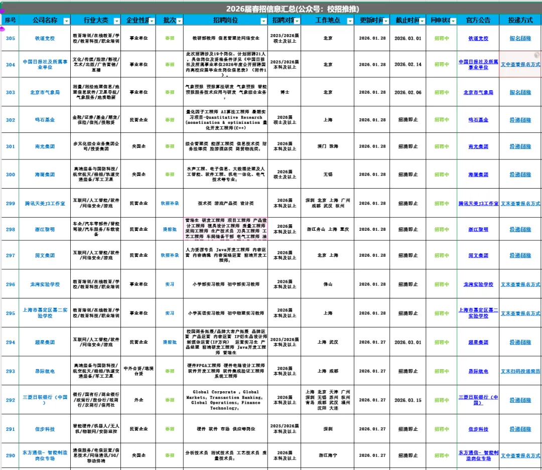 🕗 订阅费用:66元,持续更新至2026年6月30日!❗本表格为在线文档,订阅后需申请查看权限,每个订阅用户仅供本人使用,不可共享和转发,不支持表格下载/编辑/复制,介意勿订!!汇总表主要针对2026届应届生,包含2025-2026年毕业的海外留学生,部分企业会同时招录2025届同学!