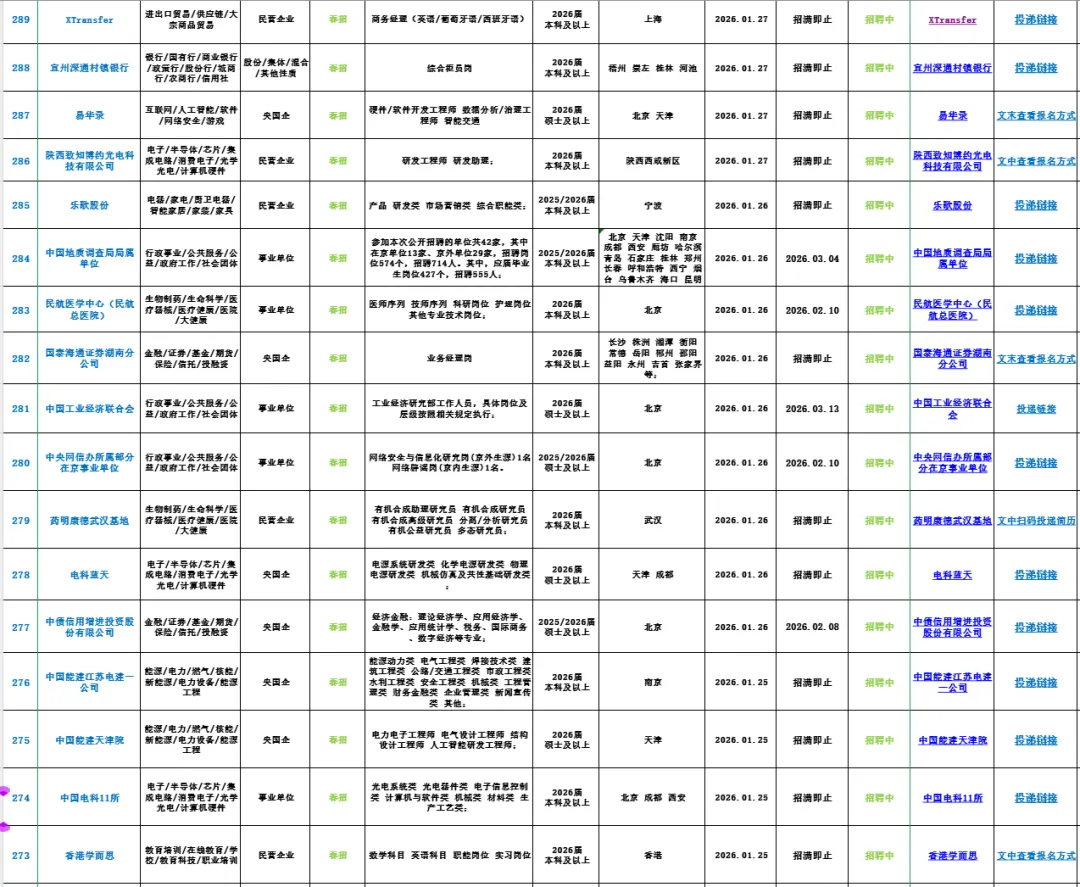 格力电器、中国汽研、中天科技集团、人民网、中央广播电视总台、中国人民银行印钞公司、人民邮电出版社、中国烟草、百度MTS管培生、中国印钞造币集团、白象食品、佳都科技、涂鸦智能、中国船舶集团、TP-LINK、中国能建、中国电科、南光集团等央国企、事业单位、民企、外企2026届春季校园招聘已经开启!