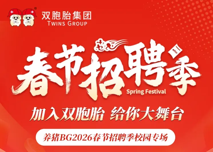 🎉 春节招聘季特别开启!双胞胎集团面向2026届高校毕业生,推出“养猪BG”专项校园招聘计划,诚邀有志青年加入,共筑农业强国梦!