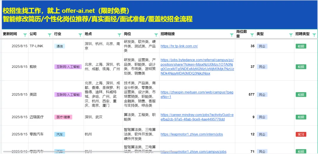 分类清晰,信息全面:表格底部按招聘主体类型进行了详细分类,包括科技、国央企、金融、汽车、快消等。从秋招提前批到春招,波哥始终是你最可靠的求职助手。