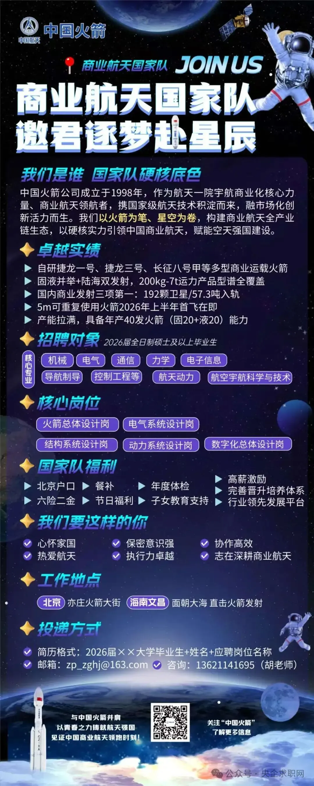 ✔ 心怀家国,志在报国✔ 热爱航天,追求卓越✔ 保密意识强,责任心重✔ 执行力强,高效协同✔ 志在深耕商业航天,共筑航天梦