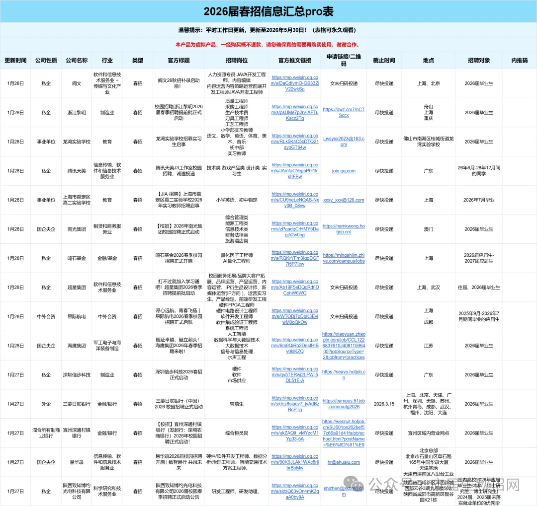 1:我们对接了大量的企业HR/高管/项目负责人/项目组成员/继任招募者,委托我们发布的实习/全职招聘信息都具有非常强的时效性!每日精选10条以上当日实习信息,会员专属!2:我们会定期整理汇总表,分时间:春招/秋招网申汇总表、寒暑假实习信息汇总表、远程实习信息汇总表等...分行业:国企央企汇总表/金融/咨询/互联网/事务所/快消岗位汇总表/国家部委招聘信息等等,每周第一时间分享到VIP会员群!部分展示示如下👇2025-2026年度会员将获得25个+招聘汇总表权益,每个表格将持续更新到周期结束覆盖行业全面:银行/证券/基金/保险/期货/互联网/电子商务/计算机软件/通信/国家机关/高校/研究所/事业单位 /教育/会计师事务所/咨询公司/法律/消费品/零售/服装/家具/贸易/制造业/汽车/电子/电器/机械/石油/钢铁/电力/能源/煤矿/化工/生物/制药/医疗/农林/畜牧/媒体/广告/旅游/公关/文化/影视/酒店.........个性化筛选:所有信息均支持自主筛选,行业-企业-截止时间-投递链接-工作地点…,分门别类,一目了然,既能海投,又能精准投递。每周校招截止提醒⏰:每周截止校招专属提醒,不错过任何一个机会!包括国央企、事业单位、民企、外企、合资企业......。