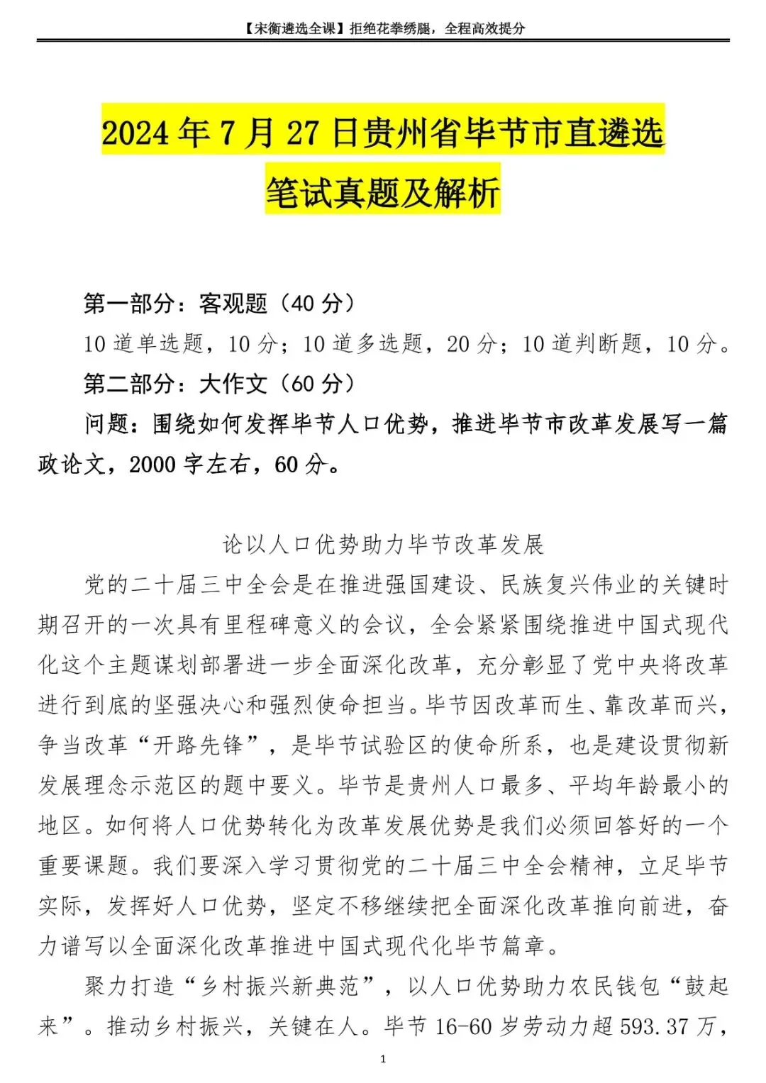 >2024年7月27日贵州省毕节市直遴选笔试真题及解析