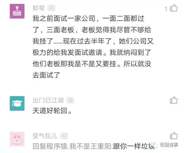 也有网友说自己面试过一家公司,在前2次面试过程中都过了,可是最后老板面试时,他认为我水平还不行。可是过了半年,那家公司现在又邀请我去面试,我就纳闷了,公司这是怎么回事呢?既然要我的话,为什么老板又要把我淘汰呢,最后果断不去面试。