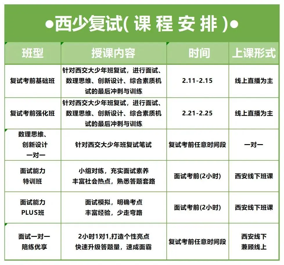 学科竞赛圈团队联合少年班信息平台为大家准备了2026西少复试全面冲刺课!助力各位考生冲刺复试!名额仅剩20人,抓紧电联张老师17800123572(同微信)、徐老师15313263274(同微信),两班联报可以优惠500元。