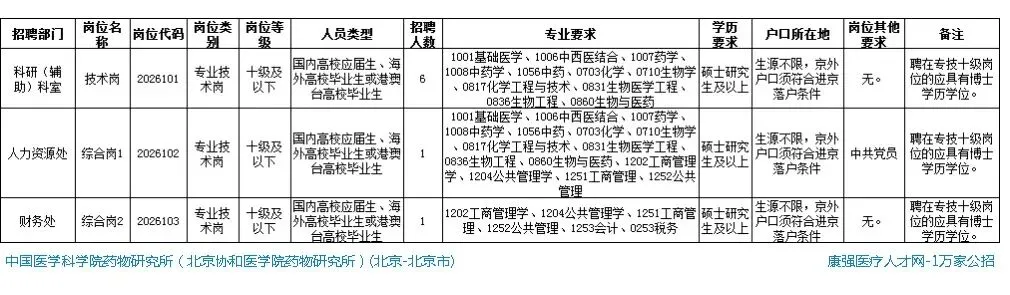 按照公开招聘工作有关规定和要求,根据工作需要,中国医学科学院药物研究所2026年度拟公开招聘高校毕业生。具体岗位及资格条件等详见《中国医学科学院药物研究所2026年度高校毕业生招聘岗位信息表》(附件,以下简称《岗位信息表》)。现将有关事项公告如下: