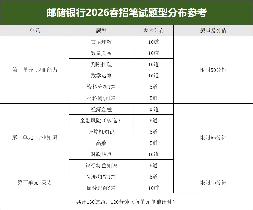 邮储银行春季校园招聘笔试内容通常涵盖以下几个方面:
